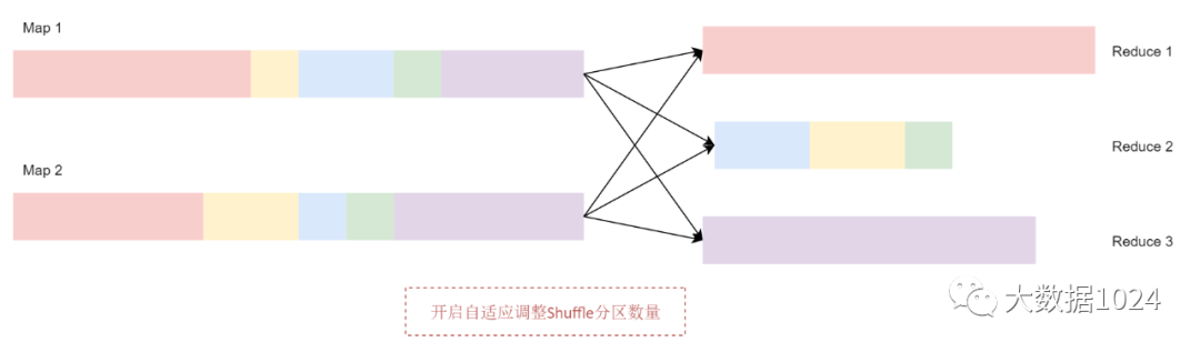 开启自适应调整Shuffle分区数量之后,Spark 会将这3个数据量比较小的分区合并为1个分区,让1个reduce任务处理,这个时候最终的聚合操作只需要启动3个reduce任务就可以了。