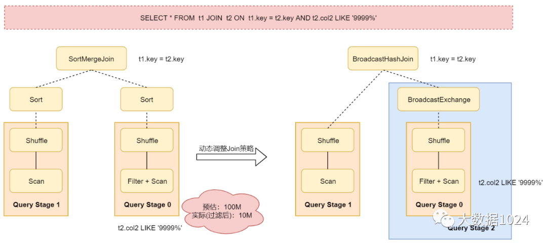 开启了自适应查询执行机制之后,可以在运行时根据最精确的数据指标重新规划Join策略,实现动态调整Join策略。