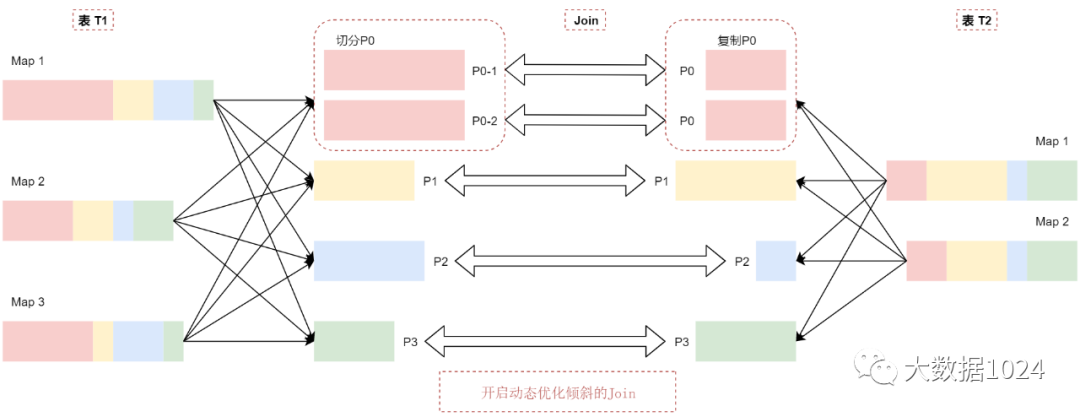 动态优化倾斜的 Join机制会把P0分区切分成两个子分区P0-1和P0-2,并将每个子分区关联到表t2的对应分区P0,看这个图: