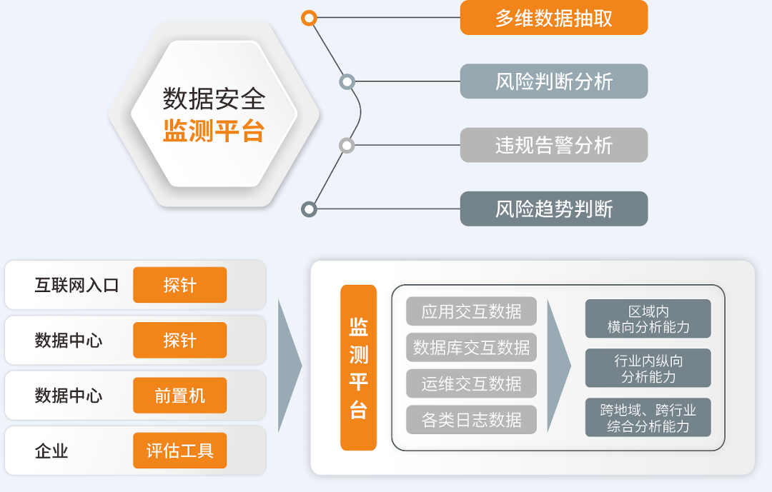 面向数据安全监管机构和大型企业集团数据安全总体责任部门,依托国家数据安全法规、行业数据安全监管政策和企业数据安全总体策略,提供面向物理和网络分散的数据使用单位和信息系统的分布式数据安全检测平台;以分布式的数据库流量探针、应用流量探针、运维流量探针、数据安全指标收集前置机、数据安全扫描评估工具为基础,实现对数据全生命周期的在线和离线合规监测;通过平台化的数据安全备案、数据访问行为分析、数据安全合规汇总能力,实现集中式的数据安全统一监测和预警。