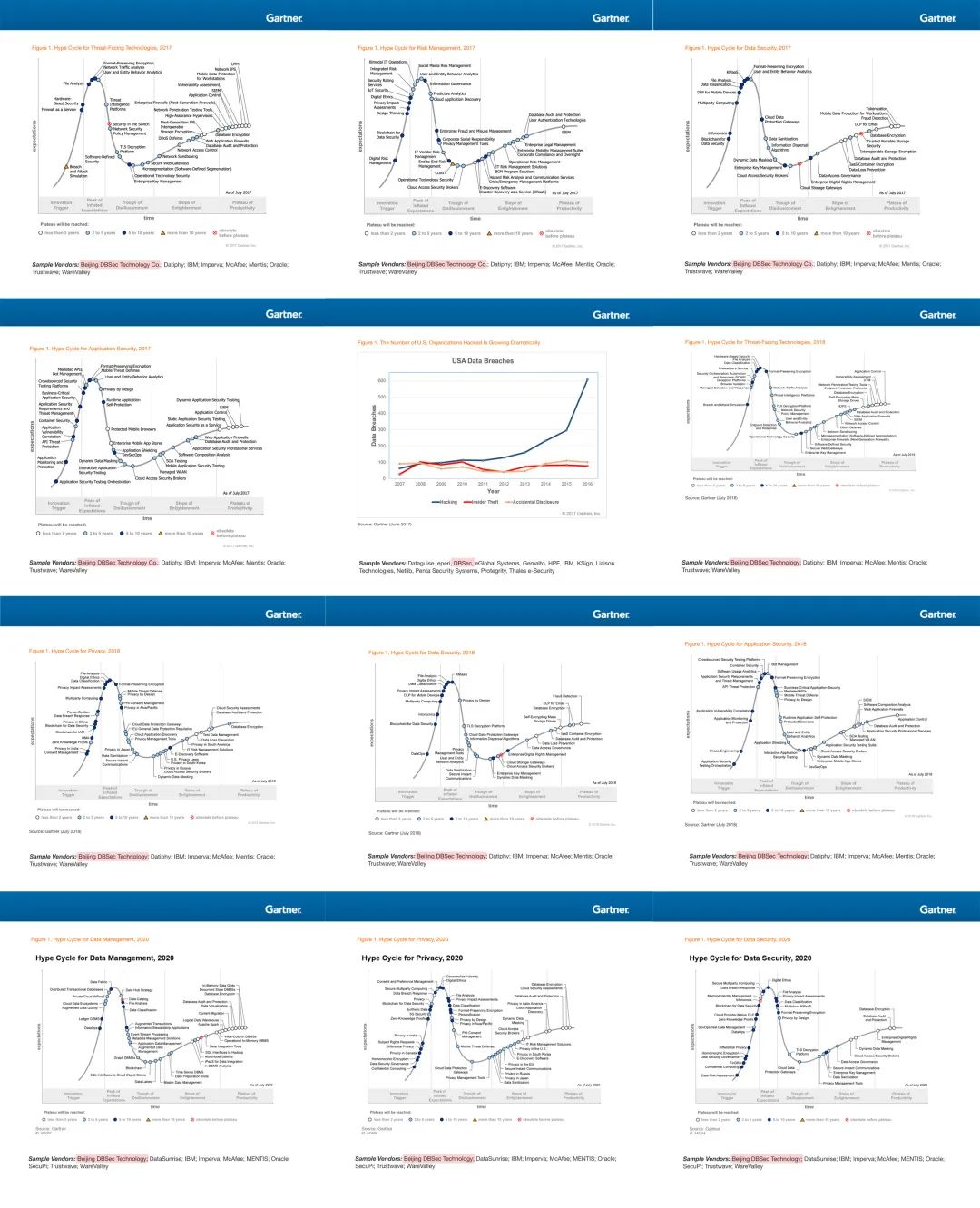 2017-2021年,安华金和累计入选Gartner涵盖“数据安全、数据管理、威胁应对、应用安全、风险管理、隐私保护”六个领域及“企业内部关键数据的分级加密”技术在内的共12份技术成熟度曲线研究报告,作为DAP(数据库审计与保护)领域代表厂商,同时也是进入该领域第一家中国数据安全企业。