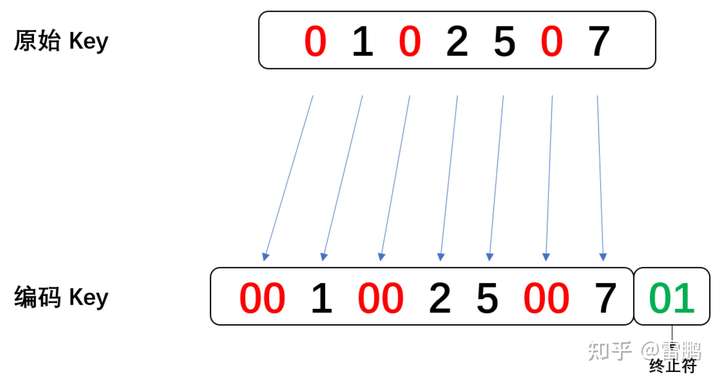 而在 Todis 中,我们会首先双写原 key 的每一个 0 , 变为 "0010025007" ;再在末尾加上终止符