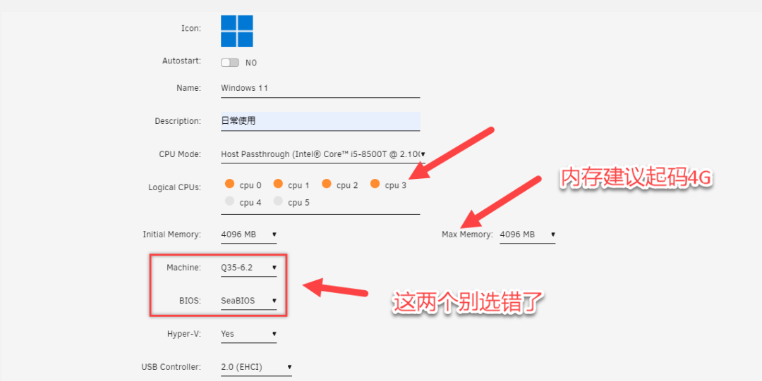 Machine和BIOS两项别选错了(至于为什么不选OVMF TPM,主要是太菜不会设置)