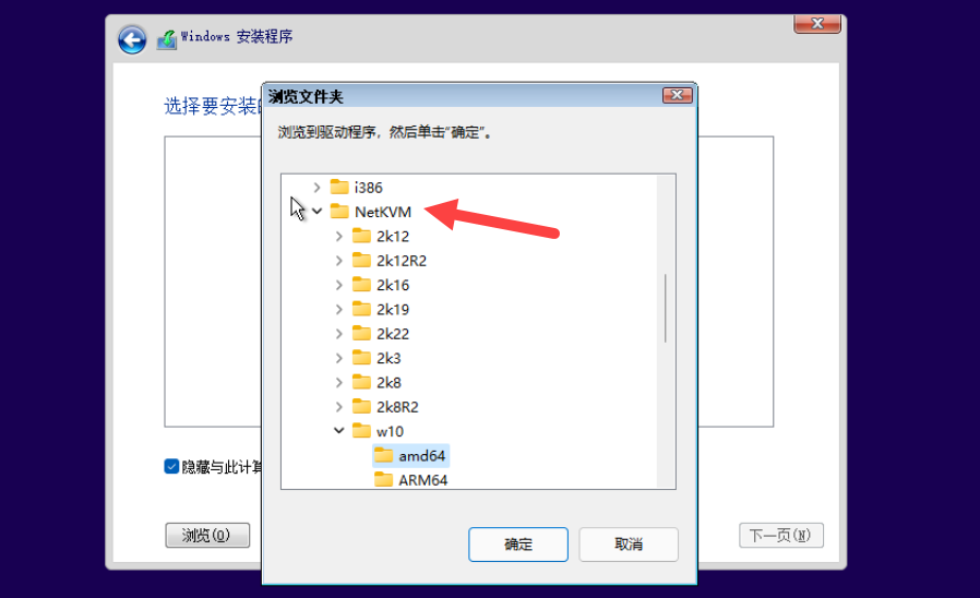 “VirtIO驱动” ->"NetKVM" ->"w10" ->"amd64"
