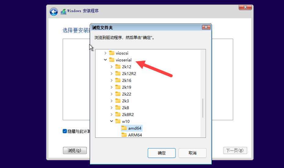 “VirtIO驱动” ->"vioserial" ->"w10" ->"amd64"