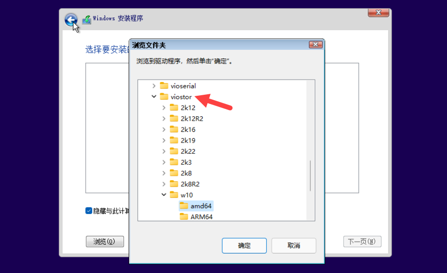 “VirtIO驱动” ->"viostor" ->"w10" ->"amd64"