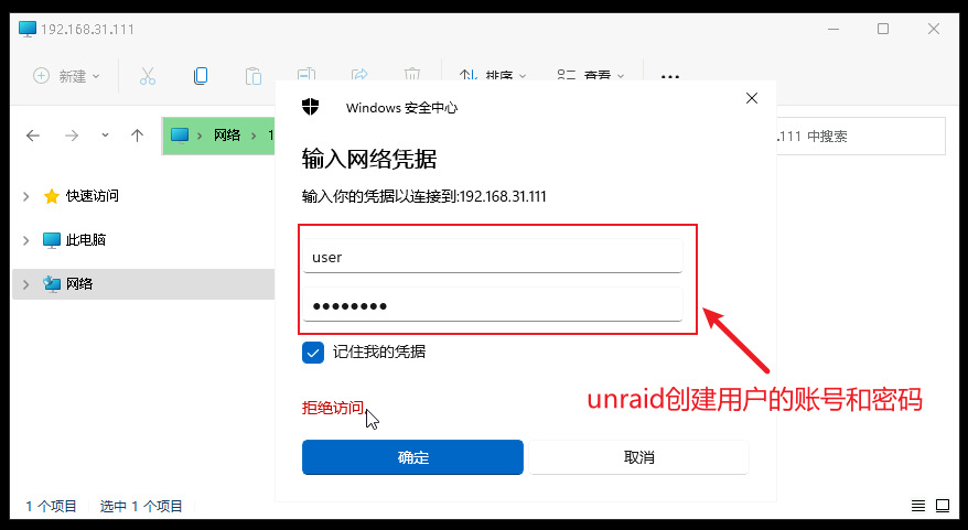 点击共享的文件,输入unraid创建的用户名和密码就可以了