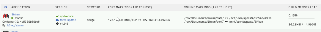 SiYuanb3log/siyuanhttps://hub.docker.com/r/b3log/siyuanhttps://camo.githubusercontent.com/b637054a2f0604c25fe9876a476117d96e16a9ec9698016252b50769108839f2/68747470733a2f2f62336c6f672e6f72672f696d616765732f6272616e642f73697975616e2d3132382e706e67http://[IP]:[PORT:6806]-resident --workspace=/siyuan -servePath=192.168.31.43:6806