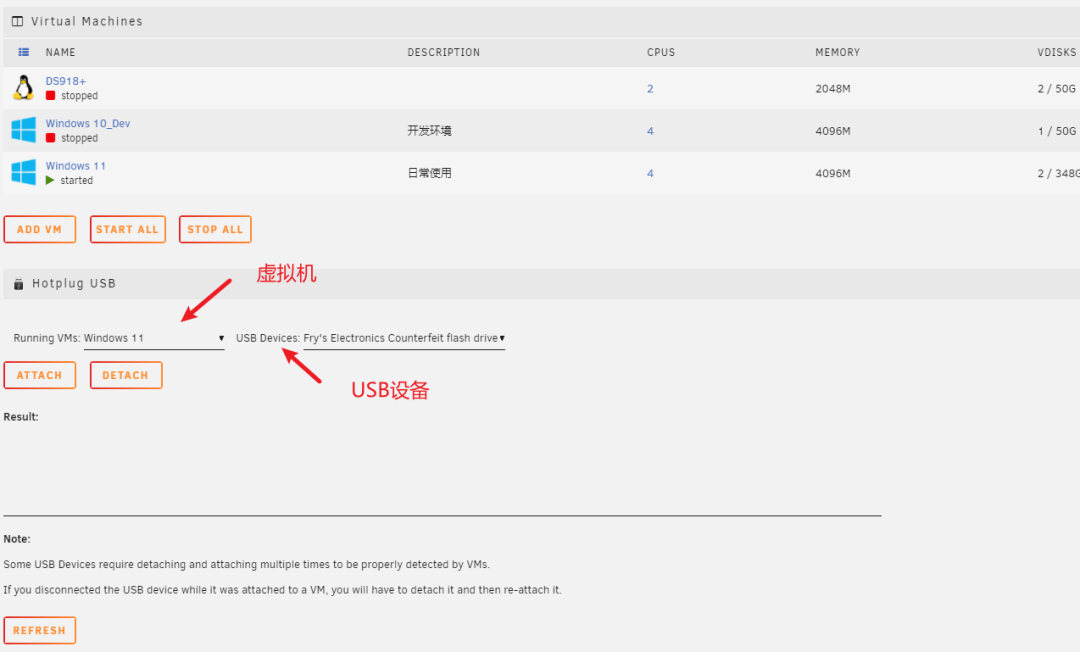 这个和常见直通不同的是,不需要虚拟机设置页面进行配置,只需要选择虚拟机和需要的USB设备即可,非常方便快速。