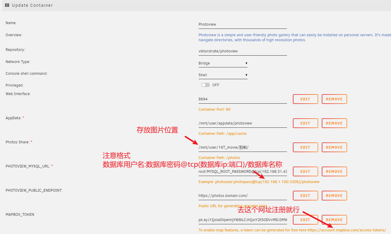 如果数据配置是和我一样可以参考root:MYSQL_ROOT_PASSWORD@tcp(192.168.31.43:3306)/photoview