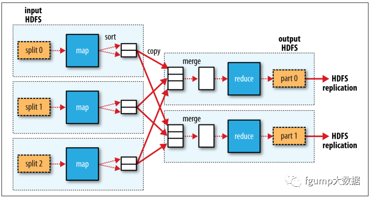 Hadoop将整个输入分为固定大小的块(input split)来作为每个Map任务的输入,也就是说针对每一个input split启动一个map task,而且常常split的大小与Hadoop分布式文件系统HDFS的block大小(128M)是相等的。这个是可以通过参数来配置的。split的大小一般设置为hdfs的block大小是因为,在大数据系统中,相对移动数据和移动程序,移动数据的开销比较大,因此通常会将map任务调度在拥有split的那个节点中运行(data locality),而如果split的大小多于1个block,不能保证节点中都拥有这两个文件block,那么这个map task无论运行在哪个节点都需要跨节点传输数据。但是有时候因为如果这个节点因为运行了其他task,并不能满足data locality,则Hadoop会尽量将map调度在和数据在的那个节点同一个机架的另一个节点中来尽量减少数据传输的开销。map task的输出仍然是key-value,但是reduce task的输入要求从每个map task 拷贝来的数据都是有序的,这一将map的输出转化为reduce task输入的过程称为shuffle。最终由reduce将结果写入到HDFS系统中,而map的输入作为中间结果则并不是直接写入到HDFS,而是写入本地磁盘(因为map task的输出是中间结果,最终整个job完成还是需要删除的。而且可能会失败,如果写入到hdfs,重新调度失败的task,不但任务要重做还要删除hdfs中的数据,hdfs中的block是有三副本的,因此写入开销比较大)。 具体的Map-Reduce过程如下图所示。map将输入split处理后的结果写入磁盘等待reduce task来拷贝,这里注意的是如果有多个reducer,那么每个map task的输出需要进行partion和sort操作(具体过程见Shuffle and Sort)。partion可以理解为对map的输出中的key进行划分,确保同一个key被分到同一个partion,而每个partion可以拥有多个key。每个partion对应于一个reducer,等全部map task完成后,对应partion的reducer会来取对应partion的数据。每个partion中的所有数据是根据key排序好的。途中表示的为三个mapper和2个reducer因此,每个mapper的输出被分为两个partion。具体的sort和partion过程,以及数据的存放形式见Shuffle and Sort。