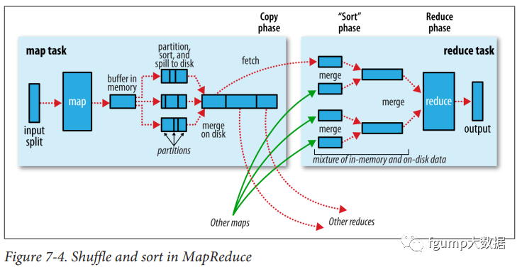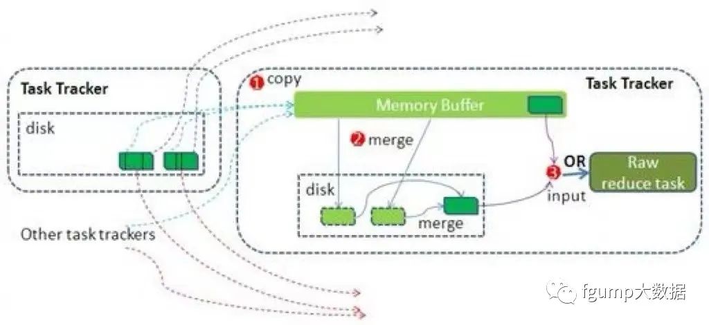 每个reducer需要跨节点来请求map task的输出。为了尽快完成数据拷贝,每当有一个map任务完成,reducer都会去获取数据(多线程)。map的任务完成后会通知application master(YARN中会讲到,applicatinn master是监控任务的执行情况),而每个reducer会有后台线程不断的去询问applicaton master是否有map完成并获取map输出文件位置。拷贝来的数据首先写入到内存buffer,这个buffer大小可以设置,通常比较大,因为shuffle阶段,reduce无法进行。当内存buffer中数据达到某个阙值(默认0.8)则类似于map阶段,溢出到文件。则最终也会在磁盘生成多个split file如下图所示。当磁盘中有多个split file,会有后台线程去merge这些文件。磁盘merge和内存merge是同时运行的(merge1和merge2)。最后一轮merge(merge3)通常是来自内存和磁盘,从而减少一次读写文件。最终生成一个最终的排序文件作为reduce的输入。