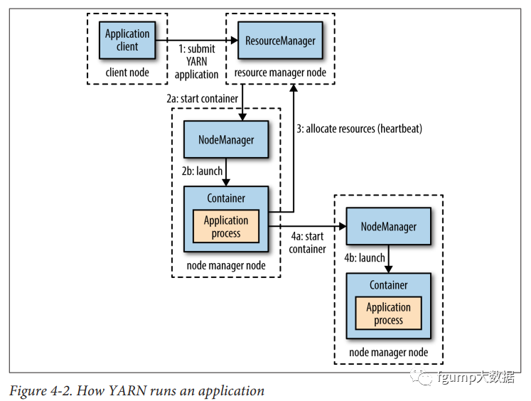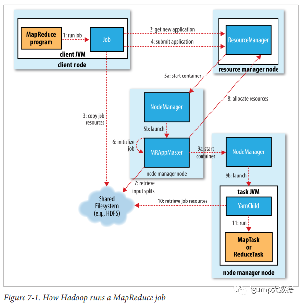 向yarn的请求资源的流程为上图所示。首先客户端向resource manager提交job(step1),资源管理器会首先联系某个NodeManager启动一个Cotainer来运行application master(step2a和step2b),application master运行的程序根据不同的上层应用而不同。如果本节点的container满足了程序的要求,那么无需申请更多container,否则该applicatin master会向resource manager请求更多container(step3),然后会联系其他的node manager进行分布式计算(step4a,step4b)。具体的以Hadoop提交map-reduce作业为例详细解释,如下图所示。