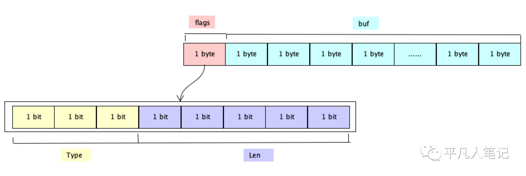 一个字节有8个bit位,其中后面5个bit位用来描述数据长度,前面3个bit作为数据类型。