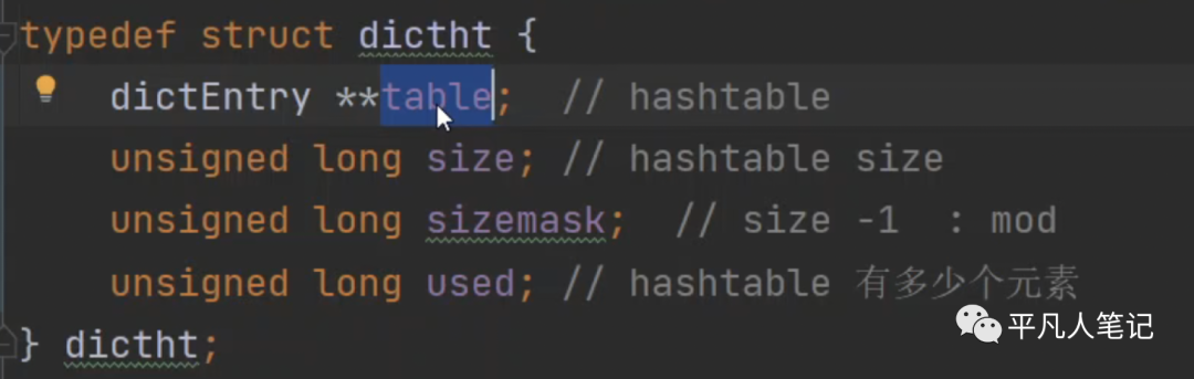 table指向了一个hash链表;sizemask是求模的一个优化;used是hashtable中有多少个元素。