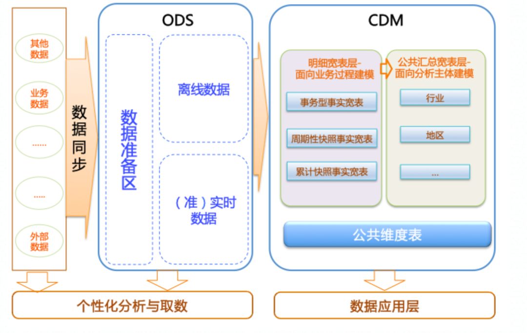 该数据分类架构在ODS层分为三部分:数据准备区、离线数据和准实时数据区。在进入到CDM层后,由以下几部分组成:
