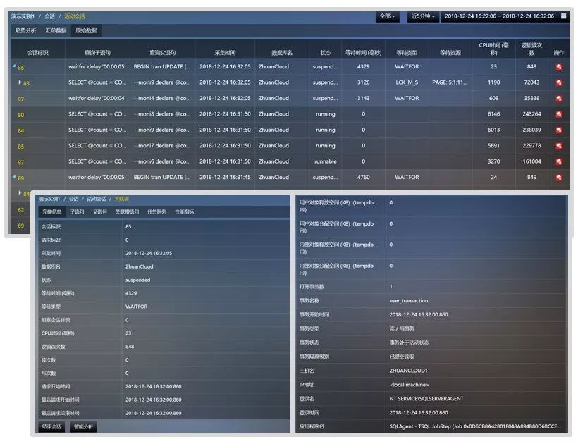 阻塞分析:自动形成阻塞树,快速、精准定位阻塞源头,可在SQL专家云中快速结束阻塞源头,并提供智能分析,防止误杀会话。