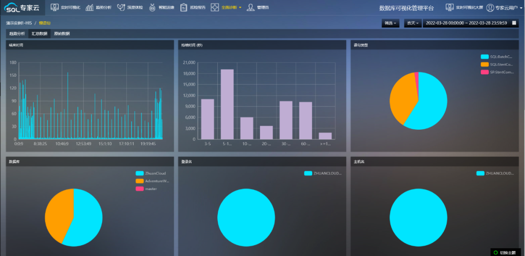 汇总分析:对任意时间段内语句进行汇总分析,按照执行次数多、资源消耗高、执行时间长等多个维度找到低效的语句。