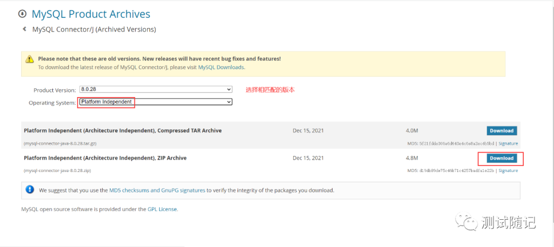 1、下载相应版本的mysql驱动,下载地址:https://dev.mysql.com/downloads/connector/j/;下载后的文件解压,将jar文件放入安装的jmeter的bin目录下