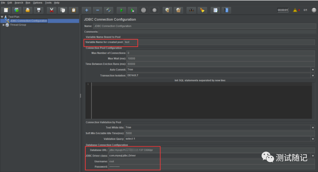 4.1、Variable Name for created pool:值可修改,后续JDBC Request元件的Variable Name of pool declared for JDBC Connection Configuration 会用到设置的值