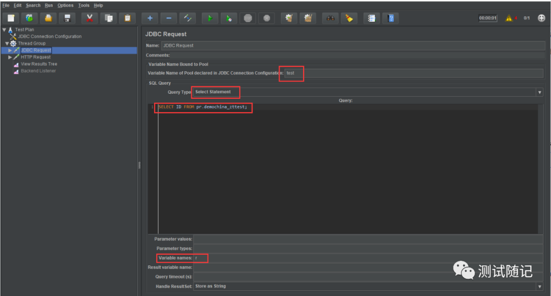 注意:Query Type选择Select Statement模式下,sql语句不能用占位符(?),可以使用${变量名称},引入变量;Query Type选择Prepared Select Statement,sql语句可以使用${变量名称}和占位符(?)两种方式;sql语句使用占位符方式可以结合Parameter valus、Parameter types参数使用