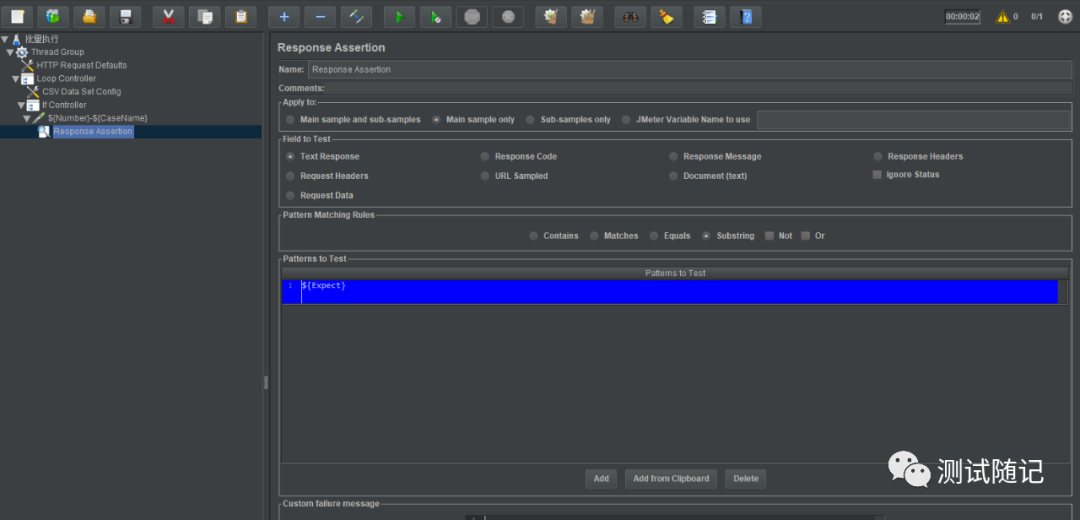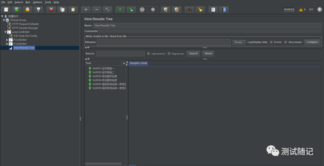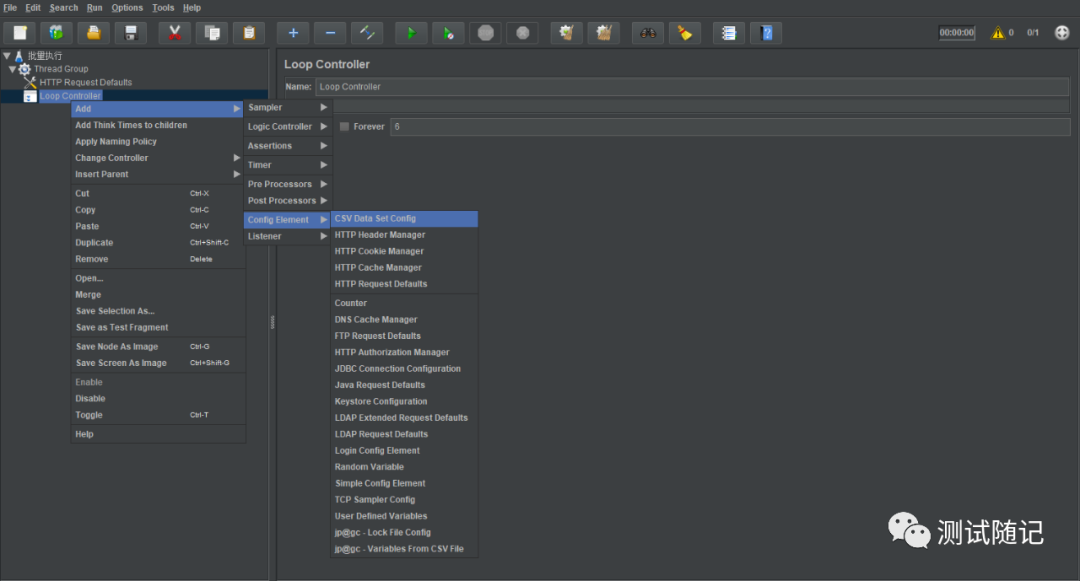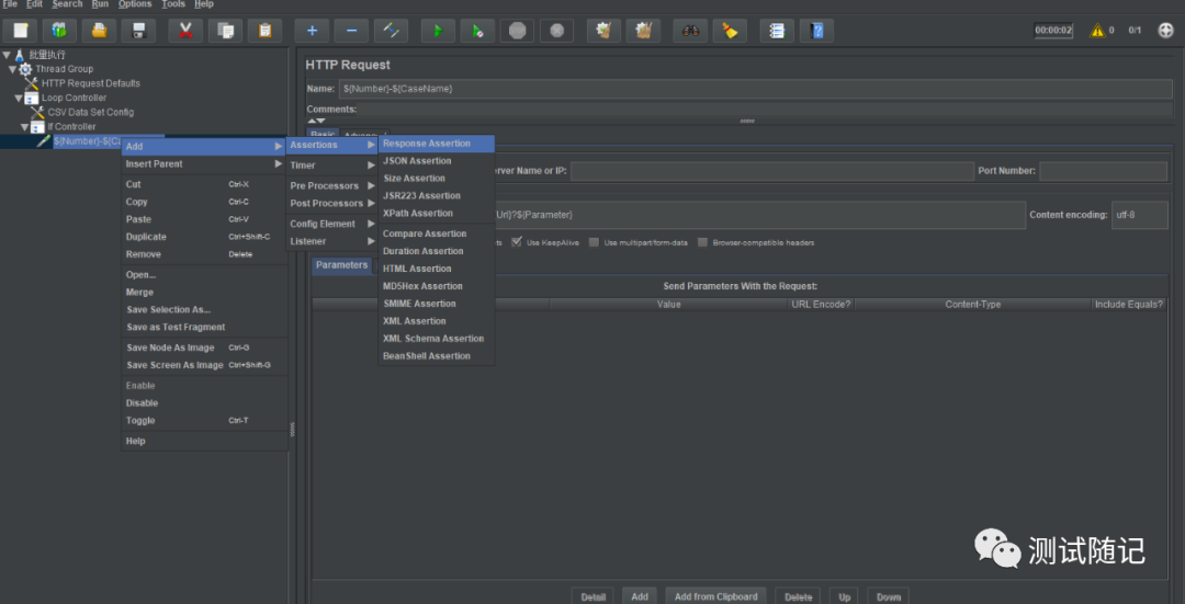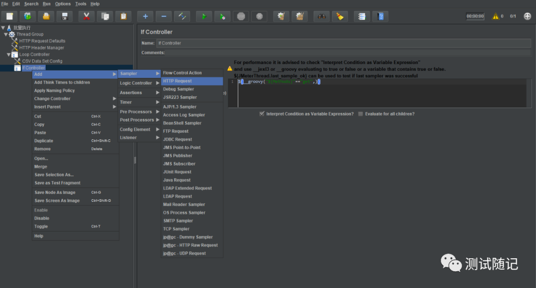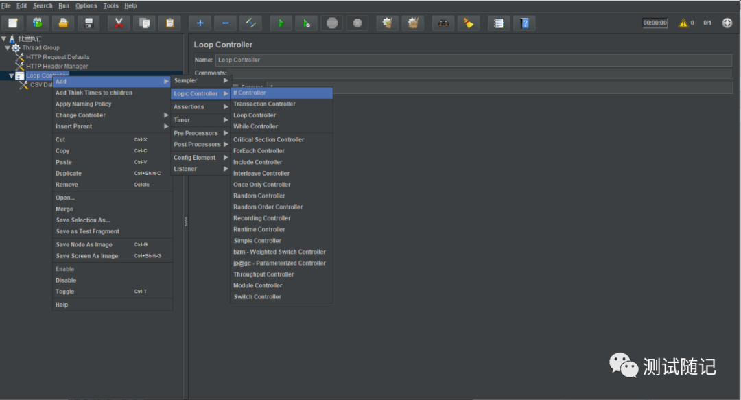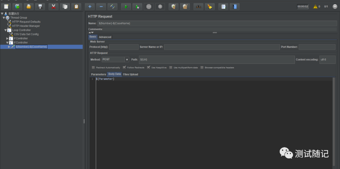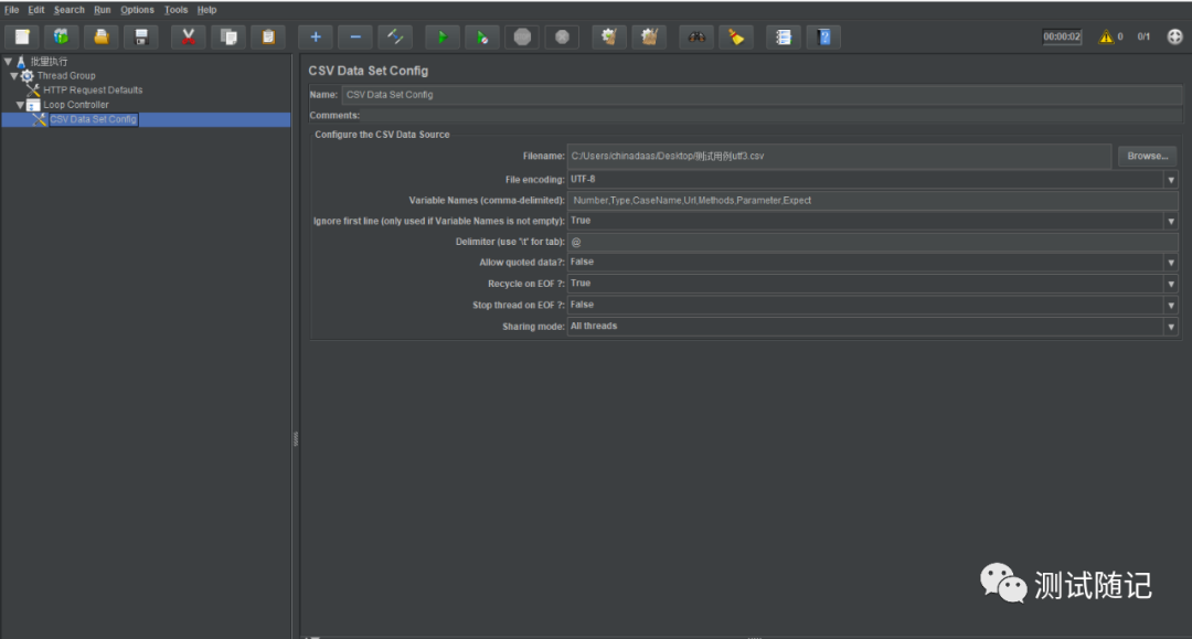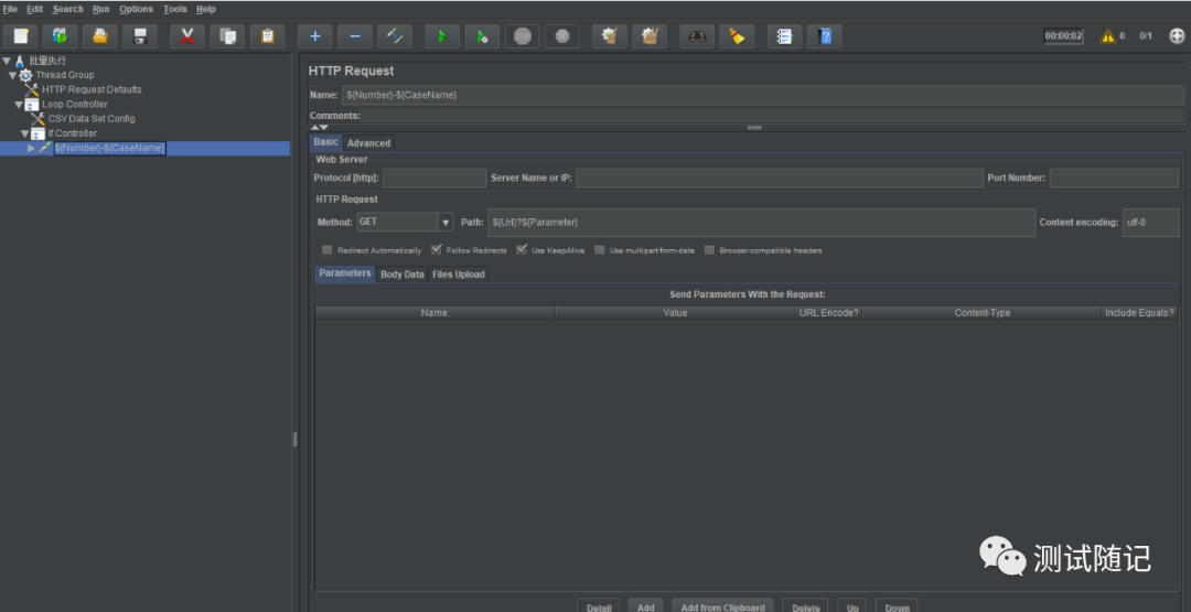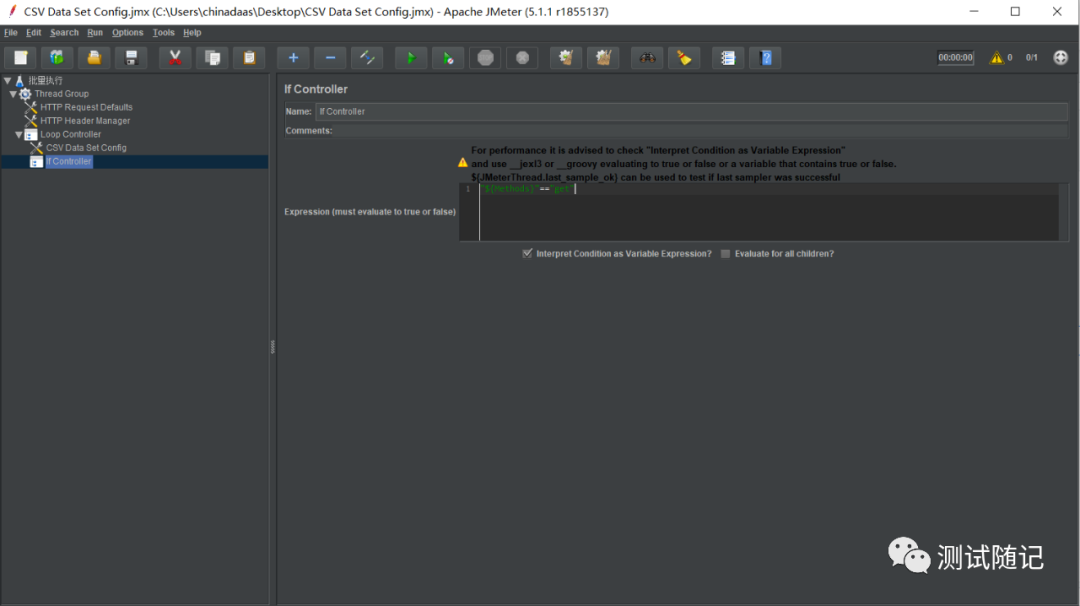 Jmeter批量测试,可以将多个接口的基本数据存储在一个csv文件中,通过循环控制器和IF控制器,循环判断相应数据,发送相应请求数据,实现批量访问1、将接口数据存储在一个csv文件中,第一列是字段名称,对应的列的数据要和相应字段匹配,如图显示基本的get和post请求的接口,因为本次测试的post接口参数用的是json数据,所以分隔符我采用的是@符号进行分隔;get请求的参数的键和值用等号连接,多个键值对用&符号连接(由于excel转csv文件编码格式有问题,直接采用csv文件进行测试)2、选中线程组元件,添加HTTP Request Defaults元件,填上接口请求的方式及IP,方便管理3、选中线程组元件,添加循环控制器,用来控制循环次数4、选中循环控制器,添加CSV Data Set Config元件,用来提取CSV文件的数据4.1、Filename:填写csv文件的路径及名称4.4、File encoding:选择相应的编码方式4.3、Variable Names:设置变量名称,后续会用到4.4、Ignore first line:若csv首行数据是字段名称,选择true,否则选择false4.5、Delimiter:填写csv文件对应的数据分割符号,本次测试选择的是@符号5、选中循环控制器,添加if控制器,用于筛选符合条件的测试数据,如下通过判断是否是get请求,若是get请求则执行相应测试数据 6、可以直接填写"${Methods}"=="get",判断是否get请求;为提高效率使用函数方法,通过函数助手生成${__groovy("${Methods}"=="get",)}7、选中if控制器,添加HTTP Request元件 7.1、name填写:${Number}-${CaseName},执行结果可以看到相应用例信息,这个根据需要自定义设置 7.2、method选择:get 7.3、path填写:${Url}?${Parameter};get请求将url和parameter拼接在一起