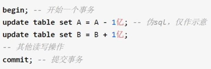 原子性,确保不管交易过程中发生了什么意外状况(服务器崩溃、网络中断等),不能出现A账户少了100元,但B账户没到帐,或者A账户没变,但B账户却凭空收到100元(数据不一致).A和B账户的金额变动要么同时成功,要么同时失败(保持原状)。
