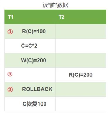 事务T1修改某一数据并将其写回磁盘,事务T2读取同一数据后,T1由于某种原因被撤销,这时被T1修改过的数据恢复原值,T2读到的数据就与数据库中的数据不一致,则T2读到的数据就为“脏”数据,即不正确的数据。