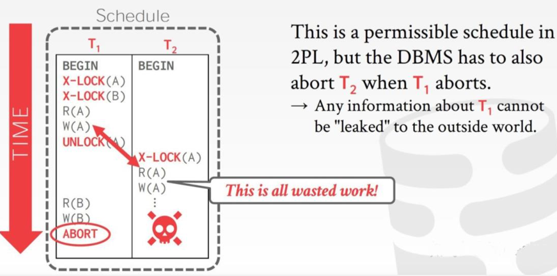 级联回滚是指一个事务的回滚引起了一系列相关事务的回滚。在两阶段协议下,级联回滚是可能发生的。如下图所示,当T1回滚后,T2也必须回滚,因为T2中
