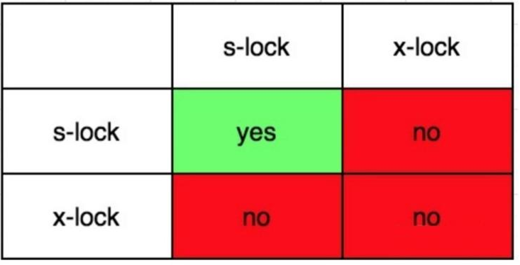 锁管理器负责锁的分配,如果请求的锁与其他的锁是相容的,那么成功分配,否则加锁请求需要等待或者失败。锁的类型可以分为s-lock(共享锁)、 x-lock(排他锁)。一般来说,读取操作需要持有s-lock、写入操作需要持有x-lock。只有两个加s-lock的请求是相容的,其他任意类型的两个加锁请求都是不相容的。