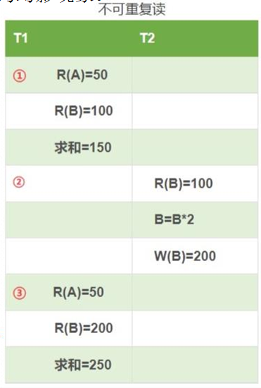 事务T1读取某一个数据后,事务T2执行更新操作,使T1无法再现前一次读取结果,包括三种情况: