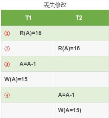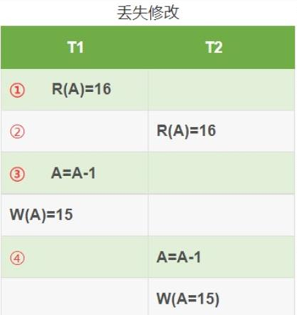 两个事务T1、T2同时读入同一数据并修改,T2提交的结果破坏了T1提交的结果,导致T1