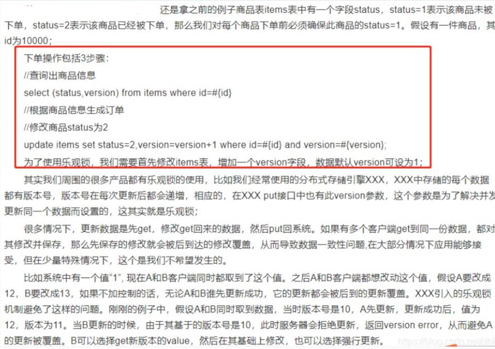 记录的当前版本信息与第一次取出来的version值进行比对,如果数据库表当前版本号与第一次取出来的version值相等,则予以更新,否则认为是过期数据。