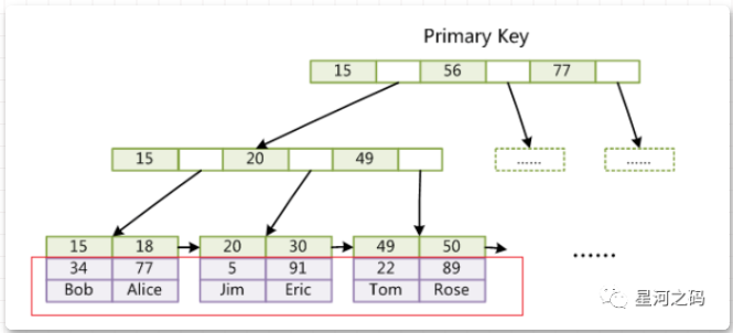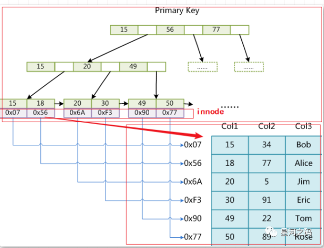 InnoDB中叶子结点中直接存储的是索引对应的数据,如下图: