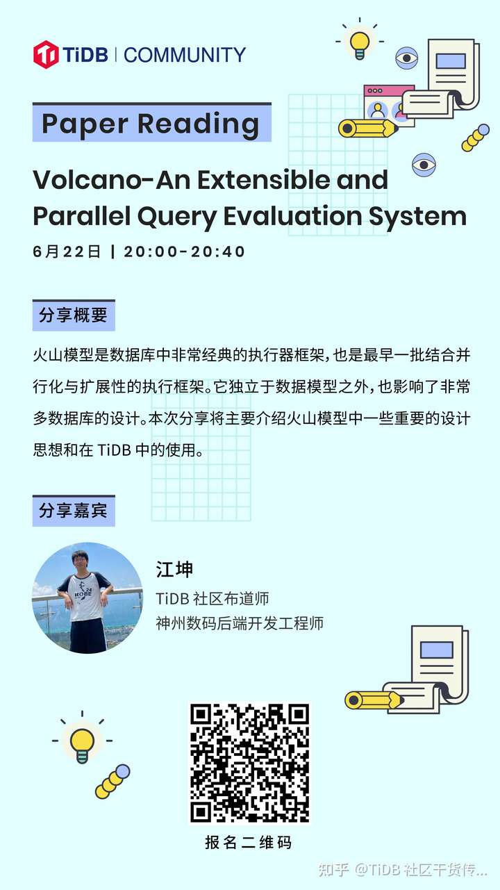 6 月 22 日 Paper Reading 再度回归,本期有幸邀请到了来自神州数码 后端开发工程师 江坤老师 @pupillord 分享《Volcano-An Extensible and Parallel Query Evaluation System》,通过这篇 paper,可以带大家了解数据库中非常经典的执行器框架——火山模型,也会向大家介绍火山模型中一些重要的设计思想以及在 TiDB 中的使用!