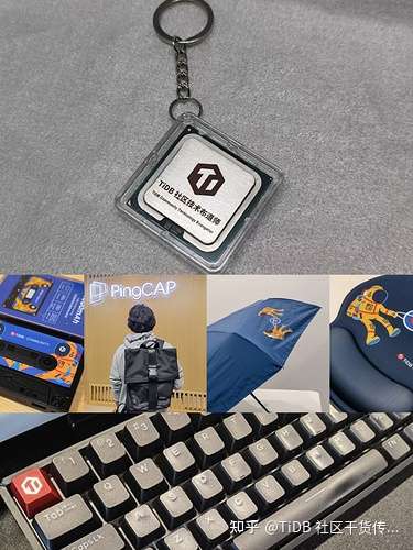 - TiDB 限量周边盲盒礼包(其中包括Ti 合金键帽、卡带复古移动充、自动晴雨伞、鼠标垫、小米屏幕挂灯、双肩背包等随机礼包)