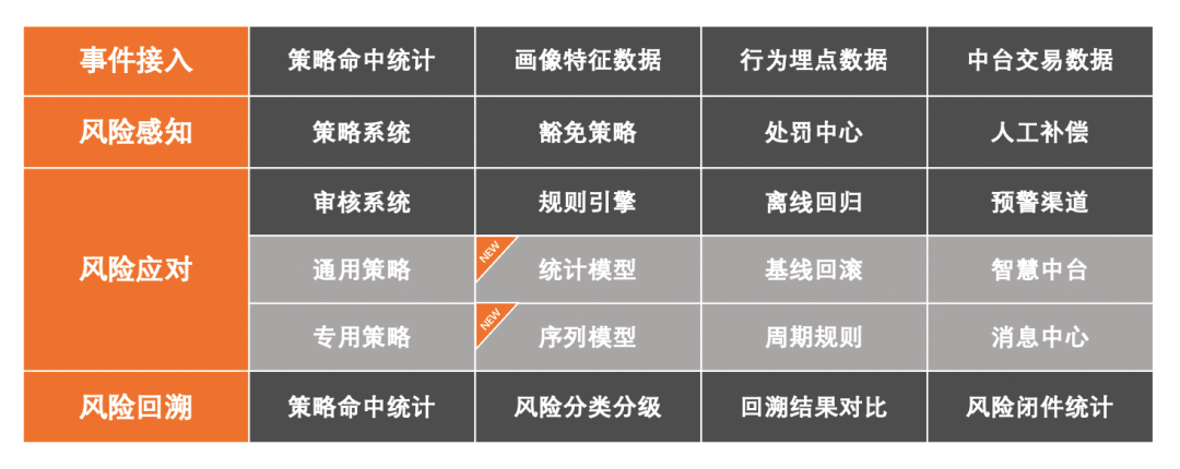 风险感知。策略调研后发布到规则引擎,并对告警结果进行离线回归和多渠道触达。 风险应对。对涉及到财务结算的规则提供再审核、豁免机制或人工补偿。 风险回溯。策略命中后进行统计和风险分类分级,预警离线回溯并对风控事件闭件。