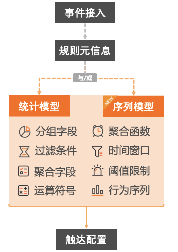 分组字段。不同字段分组、多字段分组的情况在风控规则的应用中非常常见。有如下规则样例: 以用户 ID 分组:"用户的下单次数"; 以用户 ID、区域 ID 作为分组:"用户同一段时间内不同区域的订单数"。 聚合函数。聚合函数包括业务常用的聚合逻辑,规则引擎依赖 Flink 内置丰富的累加器,并在 Accumulator 接口的基础上进行了根据需求场景的自定义实现。样例规则如下: A 门店近 30 分钟独立消费用户数小于 100; B 门店新客消费金额大于 300。 窗口周期。窗口周期也即每个窗口的大小,如业务方可能希望在持续 30 分钟的秒杀活动周期内运行规则,或者希望重点关注异常时段。 每 30 分钟时间窗口内,单个用户发起超过 20 笔未支付订单; 凌晨 1 点至 3 点,单个用户支付订单数超 50 笔。 窗口类型。为了面对不同的业务需求,我们将业务规则中常见的窗口类型集成到规则引擎内部。其中包括滑动窗口、累计窗口、甚至是无窗口(即时触发)。 聚合前的过滤条件: 只对"下单事件"进行统计; 过滤门店"虚拟用户"。 聚合后的过滤条件: 用户 A 在 5 分钟内下单次数 "超过 150 次"; 用户 B 在 5 分钟内购买金额 "超过 300 元"。 计算表达式。风控规则的字段口径通常是需要组合计算的,我们在表达式计算和编译中集成了更轻便和更高性能的 Aviator 表达式引擎。规则样例如下: 应收金额大于 150 元(应收金额 = 商品金额合计 +运费 + 优惠合计); 通过 POS 端支付的应收金额大于 150 元。 行为序列。行为序列其实也是事件与事件之间的组合,他打破了以往风控规则只能基于单事件维度描述事实的壁垒,在事件与事件之间的事实信息也将被规则引擎捕捉。规则样例如下: 用户 A 在 5 分钟内依次做了点击、收藏、加购; 用户 B 在 30 分钟前领了优惠券,但是没有下单。