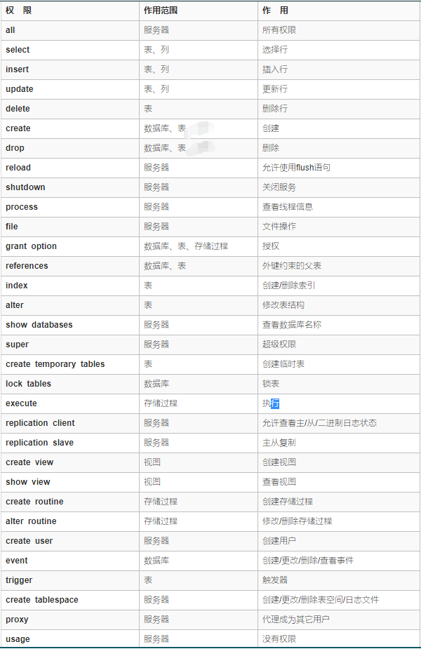 列权限在授权时如:grant select(id) on db1.tb1 to user@'%';