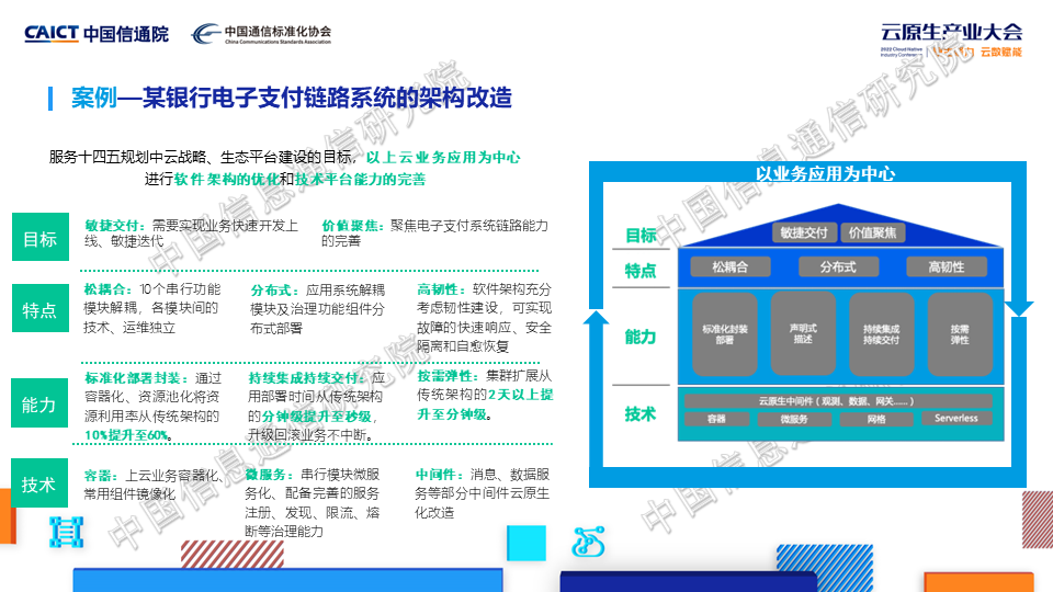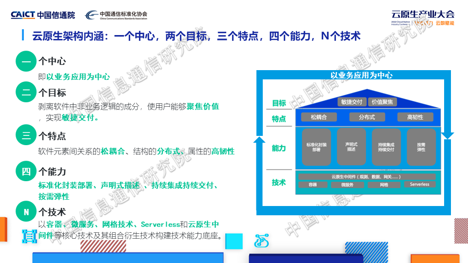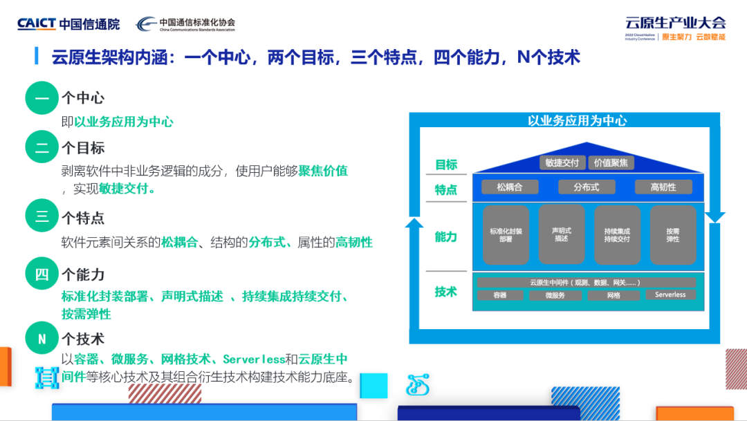 为了进一步普及云原生技术,推动云原生架构在国内的应用落地,中国信通院提出了对云原生的概念的理解,即云原生是先进软件架构技术和管理方法的思想集合,通过容器、微服务、持续交付等一系列技术,实现了信息系统由烟囱状、重装置和低效率的架构向分布式、小型化和自动化的新一代软件架构的转变。具体而言,云原生架构内涵可概括为:一个中心、两个目标、三个特点、四个能力、N个技术。