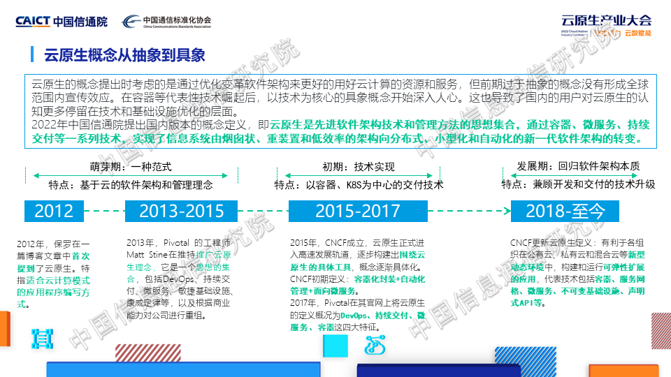云原生概念提出的初期,是一套基于云的软件架构和管理理念,由于概念较为抽象,没有在全球范围内快速的传播。容器、容器编排等关键技术崛起后,以技术为核心的云原生具象概念开始深入人心。这也导致了国内的用户对云原生的认知更多停留在技术和基础设施优化的层面。