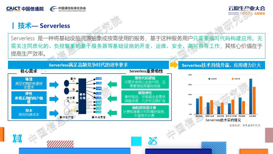 Serverless是一种将基础设施资源抽象成按需使用的服务,基于这种服务用户只需要编写代码构建应用,无需关注同质化的、负担繁重的基于服务器等基础设施的开发、运维、安全、高可用等工作,其核心价值在于提高生产效率。