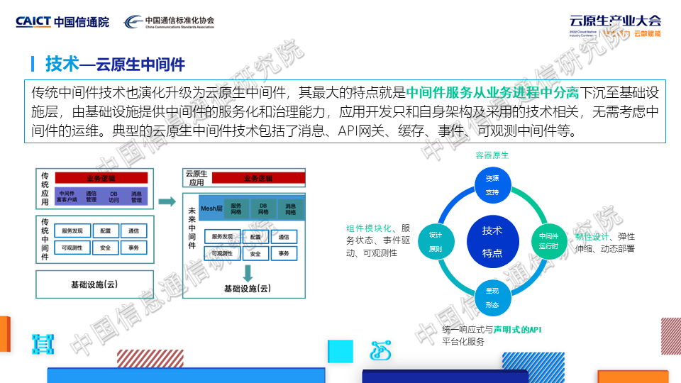 云原生中间件最大的特点是中间件服务从业务进程中分离下沉至基础设施层,由基础设施提供中间件的服务化和治理能力,应用开发只和自身架构及采用的技术相关,无需考虑中间件的运维。典型的云原生中间件技术包括了消息、API网关、缓存、事件、可观测性中间件等。