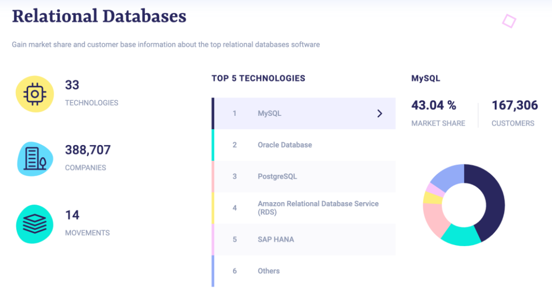 与此同时,MySQL也是全球最受欢迎的关系型数据库之一。根据Slintel网站的统计数据,在全球关系型数据库市场中,MySQL市场份额最高,达到43.04%,Oracle仅为16.76%。
