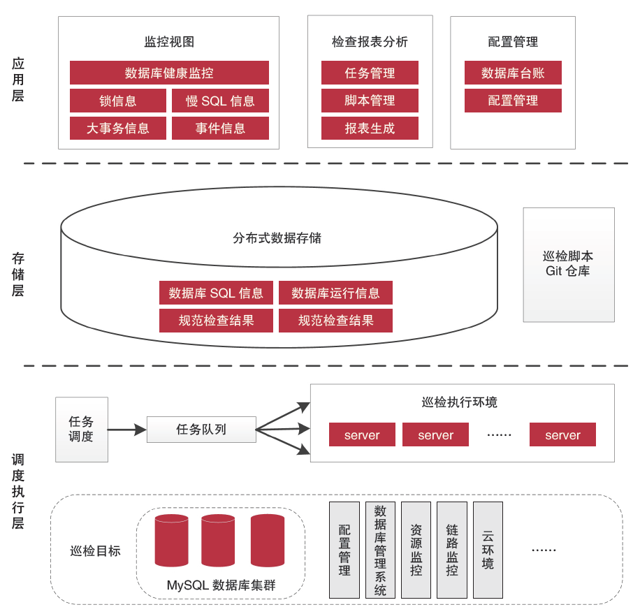 存储层不仅负责存储检查脚本,还负责存储检查结果,前者可通过GIT实现,后者则是基于分布式数据库进行存储。其中,巡检脚本管理主要是通过GIT仓库对巡检脚本进行版本管理,并使用打包工具将其同步至巡检执行机,以保证巡检脚本实时更新;分布式数据存储则是通过分布式数据库中间件将数据分散存储在不同库中,以提升数据存储能力和响应效率。