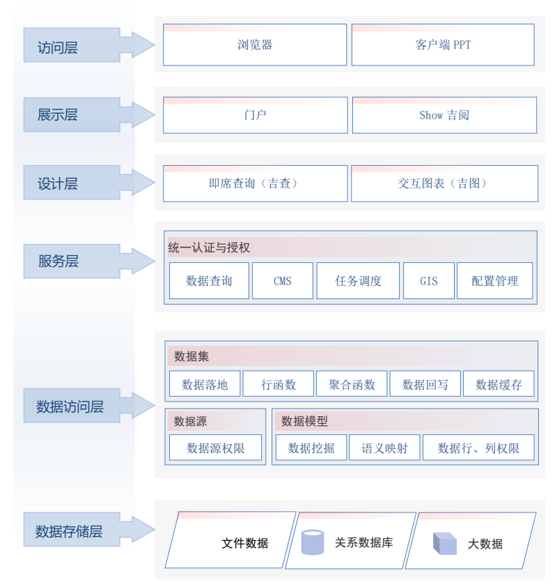 在展示及设计层面的门户、吉阅、吉查和吉图在实现中都是相互独立的 Web 项目,系统自带优化的 Jetty服务器,门户、吉阅、吉查和吉图都集成在系统自动的 Jetty 服务器中,他们都依赖于服务层和数据访问层,服务层的功能集中在 BIServer 项目中,以 OAUTH2.0 协议接口的形式提供文件管理和查询。门户中显示的个人文件数据均需要调用 BIServer 对应的接口才能显示和操作。数据访问层以 Jar 包的形势嵌入到其他模块中,从而进行统一的数据权限验证。