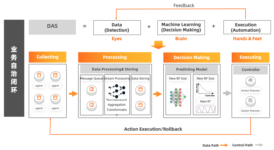 DAS核心理念本身也是来源于过往双11对数据库智能化技术趋势的思考,阿里拥有业界最富有经验的DBA,海量的性能诊断数据, 如何把阿里巴巴丰富数据库领域知识、经验、大数据以及机器智能技术结合起来,为数据库加上“自动驾驶”引擎,在数据库稳定性、效率、成本上实现最大化。在云原生时代,更是如此,应用开发者期望能够专注于自身的业务创新,而彻底摆脱数据库运维负担,让数据库高度自治。工业界和学术界在自治数据库方向达成了高度的一致,如CMU创建自治数据项目Peloton,旨在实现混合负载下的全自治。数据库自治服务DAS,就是以数据库自动驾驶为理念,基于数据驱动、专家经验和机器学习的智能化驱动,让数据库具备自感知,自恢复,自优化、自安全能力,就如同汽车被赋予自动驾驶能力。