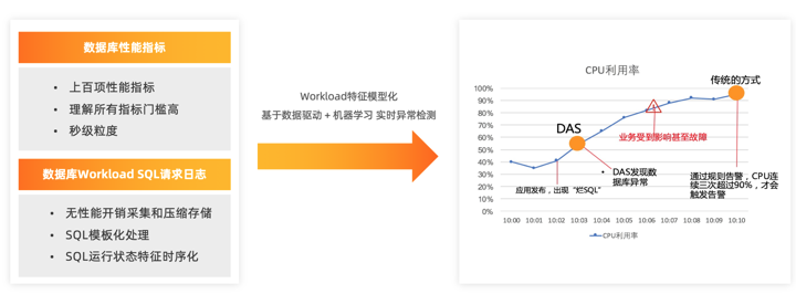 DAS的7X24实时异常检测通过机器学习算法,实时对数据库的Workload进行异常检测,相比传统基于阈值的告警方式,能够更及时的发现数据库的异常,而不是靠故障驱动。数据指标采集链路实现上百项数据库性能指标、以及负载SQL请求日志等,海量数据的离在线处理与存储,基于机器学习和数据库领域预测算法,实现各业务数据库实例的持续模型训练,结合流式和大数据分析计算框架,进行实时模型预测和实时的异常检测分析。相比传统基于规则和基于预值的方式,实时异常检测具备以下优势: