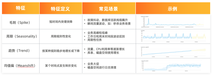如上表,现实中常见的workload场景,如毛刺特征、周期性特征、趋势性特征、均值偏移特征等, 异常检测服务都能够准确自动识别,并支持多种时序特征叠加识别,识别出异常后, 会触发基于根因的全局诊断分析,以及后续的异常恢复、优化自治场景。