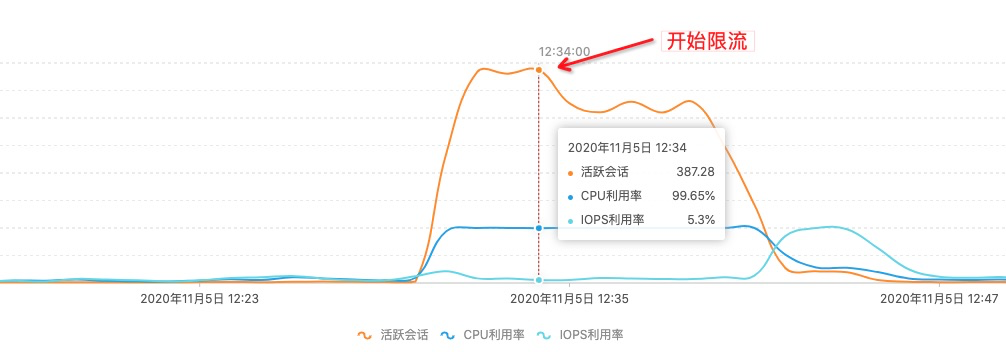 通过7 x 24实时异常检测, 数据库实例异常完成实时检测发现,DAS自动进行根因分析,自动执行相关止损/修复操作,帮助数据库自动恢复,减少对企业业务的影响。例如,自动SQL限流就是其中典型自治场景。如下图是双11期间自动SQL限流一个实际案例: